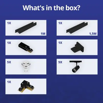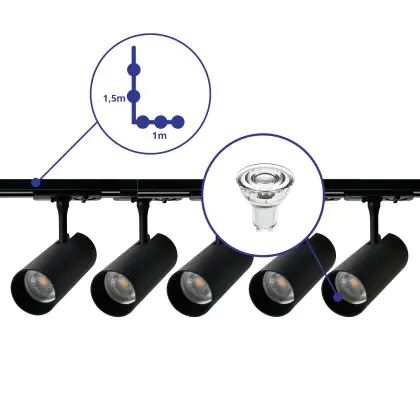 Complete Set 1-Fase Rail L 1 x 1,5 Meter Zwart | incl. 5x Spot + GU10 2700K 3W Dimbaar + Eindkap, Voedingsconnector en L -Verbindingsstuk