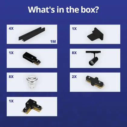 | Fabrikantnaam | Complete L shaped 1-Phase Track Set Black incl. 8x Spot fixture + GU10 2700K 3W Dim – 2 x 2 meter i | |
